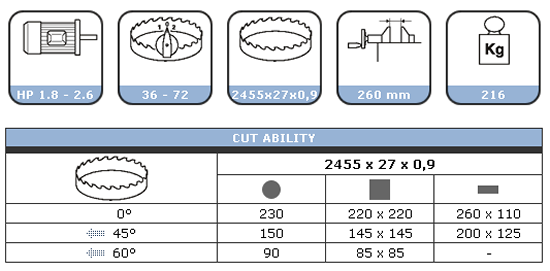 Ręczna przecinarka taśmowa. Imadło szybkozaciskowe. Rama przecinarki ułożyskowana na łożyskach stożkowych. Mechaniczny układ naciągu taśmy tnącej. Regulowane, ułożyskowane prowadnice taśmy tnącej wyposażone w płytki z węglików spiekanych. Elektryczna pompa układu chłodzenia z doprowadzeniem chłodziwa bezpośrednio do obszaru roboczego. Bimetalowa taśma tnąca. Niskonapięciowy obwód sterowania zgodny ze standardami CE. Instrukcja obsługi z tabelą części zamiennych.