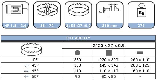 Ręczna przecinarka taśmowa wyposażona w imadło umożliwiające przecinanie materiału pod kątem do 45 ° w prawo, 45° i 60° w lewo. Rama przecinarki ułożyskowana na łożyskach stożkowych. Mechaniczny układ naciągu taśmy tnącej. Regulowane, ułożyskowane prowadnice taśmy tnącej wyposażone w płytki z węglików spiekanych. Elektryczna pompa układu chłodzenia z doprowadzeniem chłodziwa bezpośrednio do obszaru roboczego. Bimetalowa taśma tnąca. Niskonapięciowy obwód sterowania zgodny ze standardami CE. Instrukcja obsługi z tabelą części zamiennych.
