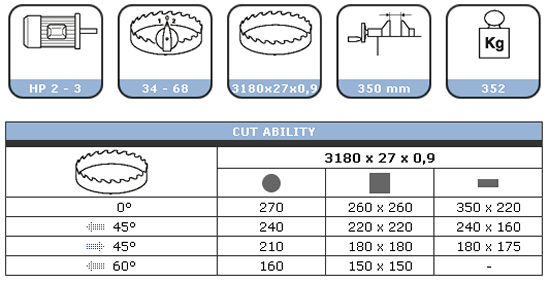 Ręczna przecinarka taśmowa wyposażona w imadło umożliwiające przecinanie materiału pod kątem do 45 ° w prawo, 45° i 60° w lewo. Rama przecinarki ułożyskowana na łożyskach stożkowych. Regulowane, ułożyskowane prowadnice taśmy tnącej wyposażone w płytki z węglików spiekanych. Elektryczna pompa układu chłodzenia z doprowadzeniem chłodziwa bezpośrednio do obszaru roboczego. Bimetalowa taśma tnąca. Niskonapięciowy obwód sterowania zgodny ze standardami CE.